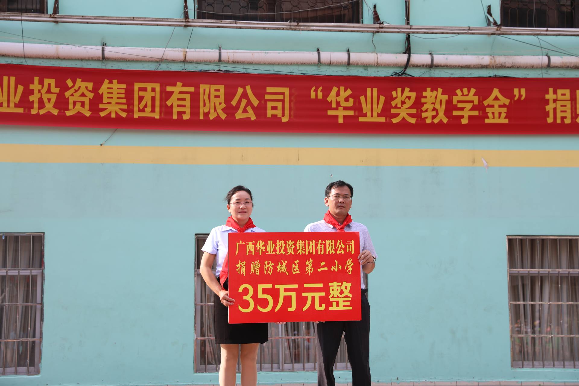 廖人興副總裁代表華業(yè)集團(tuán)向防城區(qū)第二小學(xué)捐贈(zèng)獎(jiǎng)教學(xué)金35萬元