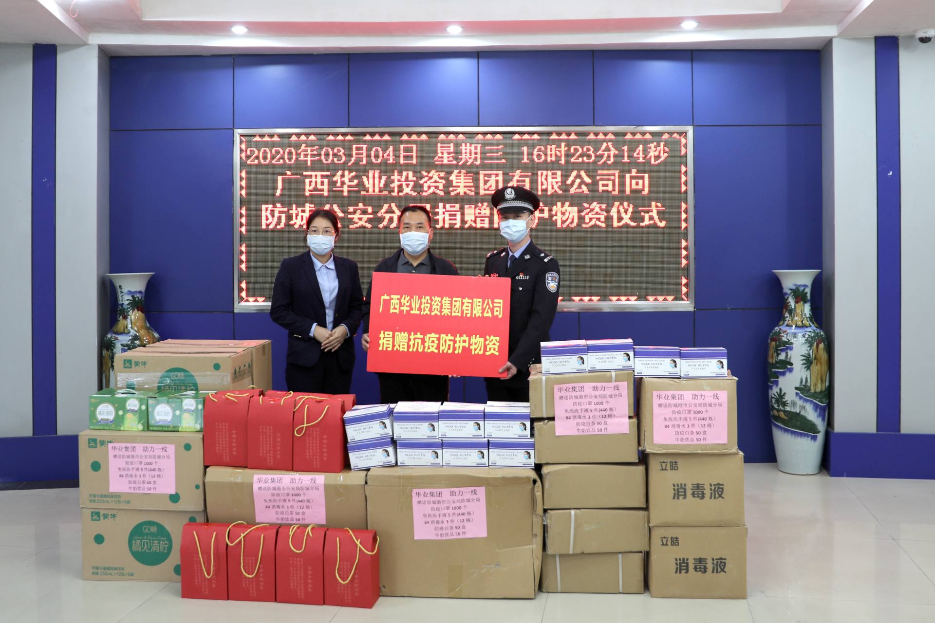龍其偉總裁、鐘麗霞主席代表華業(yè)集團(tuán)向防城公安分局捐贈(zèng)抗疫防護(hù)物資