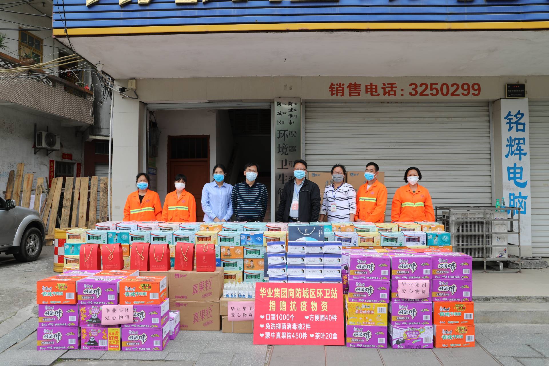廖人興副總裁、鐘麗霞主席代表華業(yè)集團(tuán)向防城區(qū)環(huán)衛(wèi)站捐贈(zèng)防疫物資