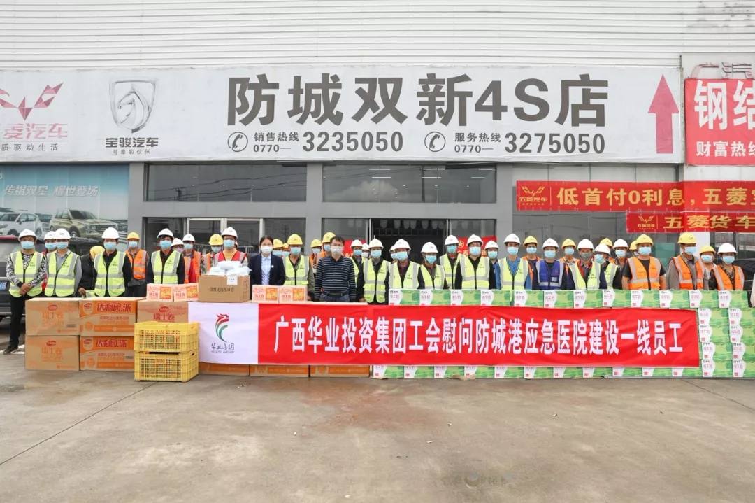 2020年2月15日,廣西華業(yè)投資集團(tuán)副總裁廖人興、工會(huì)主席鐘麗霞代表華業(yè)集團(tuán)在華業(yè)汽車城慰問連日來奮戰(zhàn)在防城港市第一人民醫(yī)院感染性疾病科應(yīng)急負(fù)壓病房項(xiàng)目建設(shè)一線的員工,為他們送去牛奶、水果等慰問品和防護(hù)用..